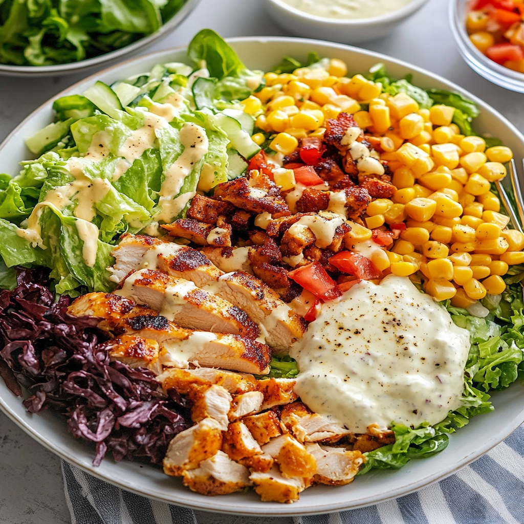 Start by cooking the chicken to golden perfection in a hot skillet. While the chicken sizzles, prepare your veggies and whip up that creamy garlic ranch dressing. Finally, assemble the salad for a beautiful presentation.