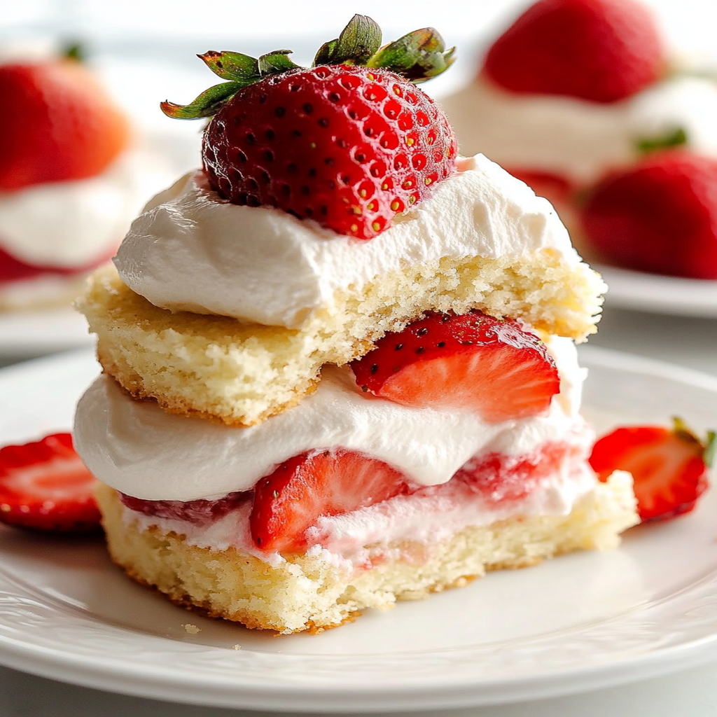 Start by preparing the biscuit base; bake them to golden perfection while you slice the strawberries. Let those juicy gems marinate with sugar as they create their own sweet syrup. Finally, whip up some cream to crown your masterpiece.
