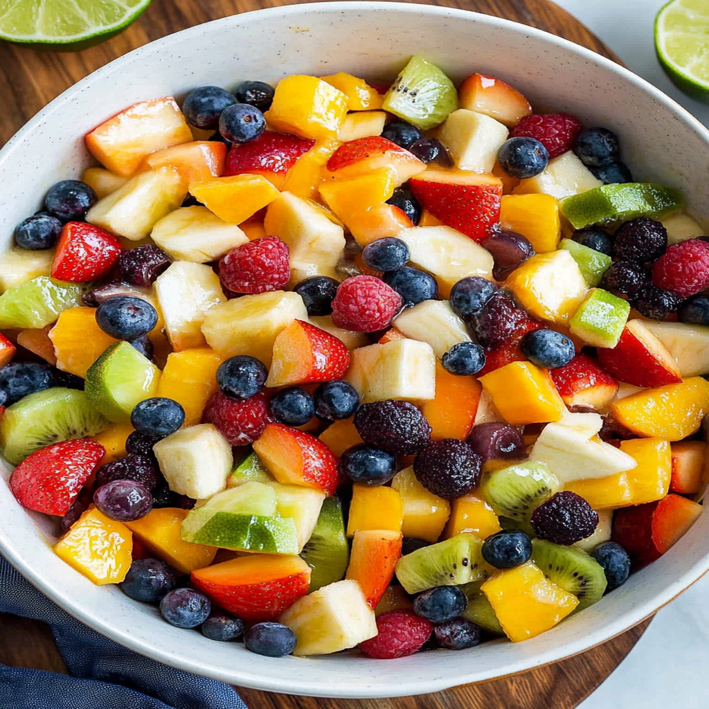 Fruit Salad with Honey Lime Dressing is a colorful and refreshing dish that celebrates the natural sweetness of fresh fruits. Featuring juicy strawberries, sweet pineapple, and tangy kiwi, this delightful salad is drizzled with a zesty honey lime dressing that enhances every bite. Perfect for summer picnics, barbecues, or as a healthy snack, this fruit salad is not only visually appealing but also incredibly easy to prepare. Enjoy a taste of tropical paradise in every spoonful!
